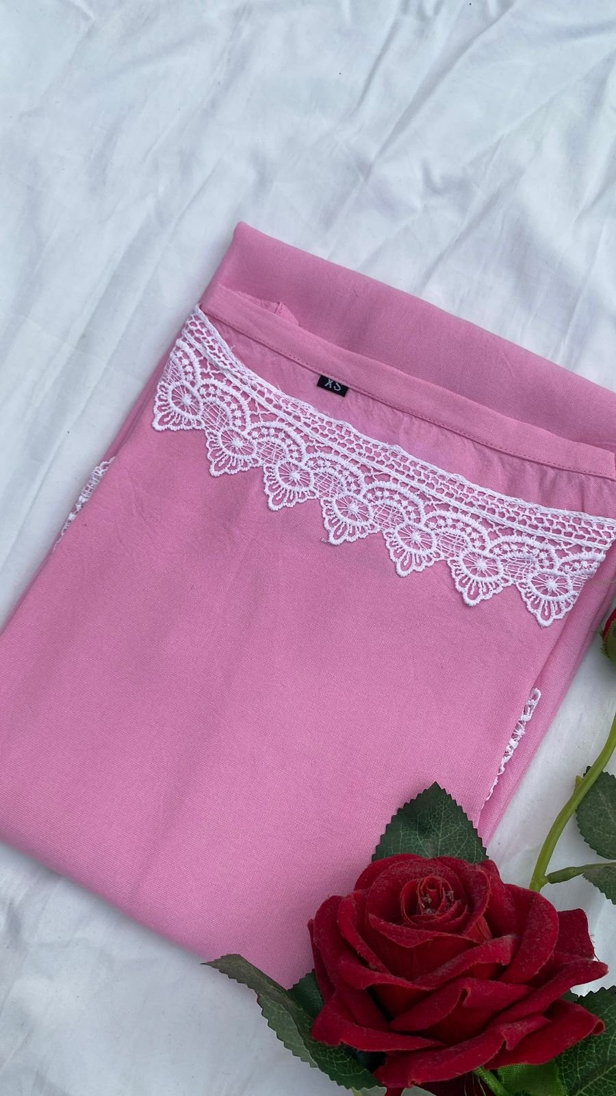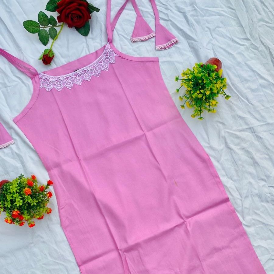 Experience comfort and charm with this elegant pink night dress. Designed with soft, breathable fabric, it ensures a relaxed and soothing feel throughout the night. The delicate white lace detailing along the neckline adds a touch of femininity and sophistication, while the adjustable shoulder straps provide a perfect fit. Ideal for bedtime or lounging at home, this piece beautifully balances style and comfort.